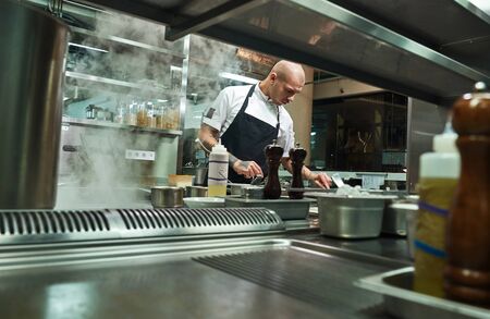 Famous chef in black apron working in a restaurant kitchen