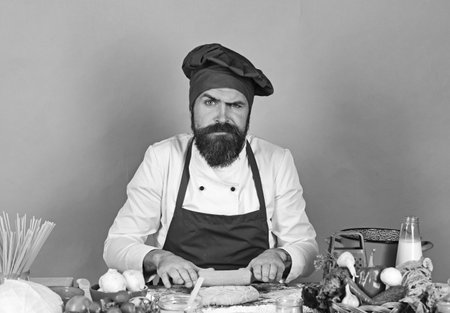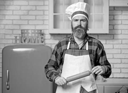 Professional cookery concept. Man with beard holds rolling pin