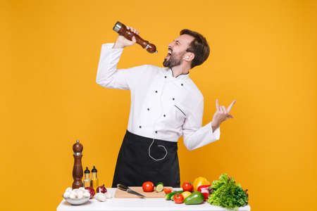 Crazy bearded male chef cook or baker man in white uniform isolated on yellow background. Cooking food concept. Mock up copy space. Cooking at table, listen music with earphones sing in pepper shaker.