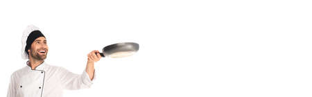 Smiling chef holding blurred frying pan isolated on white, banner