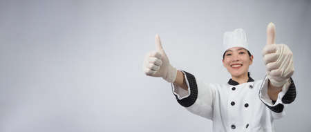 Asian woman chef holding smartphone or digital tablet and received order from online shop or merchant application. she smiling in chef uniform and standing in white background. Online food merchant.