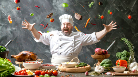 A cheerful chef exuberantly flings vegetables and meat into the air, showcasing his passion for cooking amidst a vibrant array of fresh ingredients.