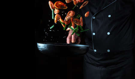 Professional chef cooks shrimp in a pan with vegetables. Cooking seafood, healthy vegetarian food and food on a dark background. Freezing in motion. Free advertising space