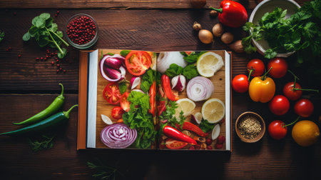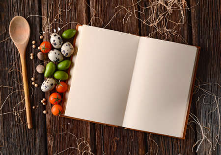 Open book on the table in the kitchen with fresh vegetables and spices
