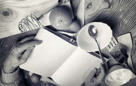 Recipe book in the hands of an elderly woman