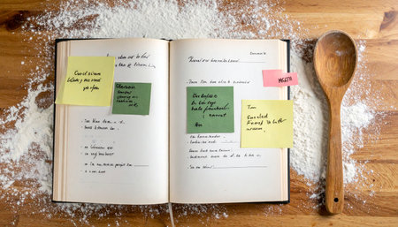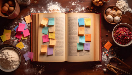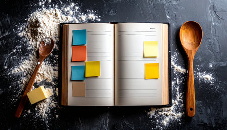 Overhead shot of a cookbook with handwritten recipes on assorted sticky notes protruding from pages, flour-dusted kitchen counter, wooden spoon