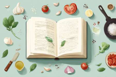 An open cookbook showcases recipes while various fresh ingredients like tomatoes, garlic, and spinach surround it, creating a vibrant culinary feel.