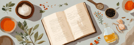 A beautifully arranged kitchen scene showcasing an open recipe book on a wooden table, surrounded by kitchen utensils, ceramic dishes, and vibrant greenery for an inviting atmosphere.