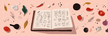 Brightly illustrated open recipe book surrounded by colorful ingredients, emphasizing creativity in cooking. Ideal for meal planning and culinary exploration.