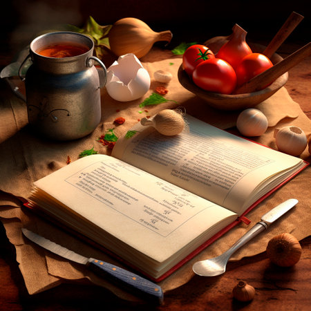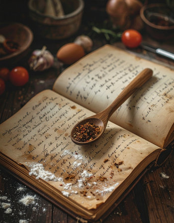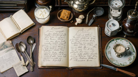 A beautifully arranged scene featuring a vintage cookbook, antique utensils, and handwritten recipes on a wooden table, evoking warmth and nostalgia for culinary traditions.