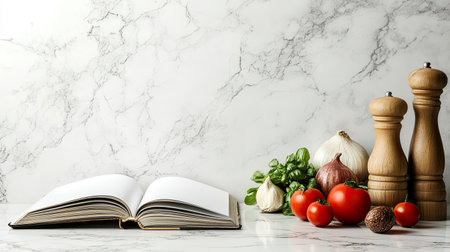 An open cookbook rests on a marble countertop surrounded by fresh ingredients like tomatoes, garlic, and onions, ideal for culinary endeavors.