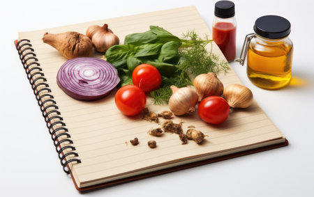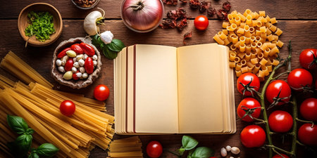 Baking and Cooking Ingredients Pasta Tomato Basil And blank recipe book Template Background. Top View Copy Space. Generative ai.