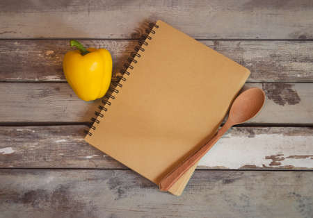 Opened notebook for notes and yellow sweet pepper on aged wooden background. Top view, copy space.