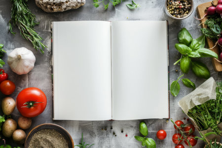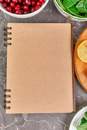 Blank cookbook surrounded by various fresh ingredients on a gray table.