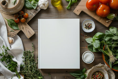 Blank white book cover mockup on a kitchen table surrounded by fresh herbs and food ingredients. AI generative