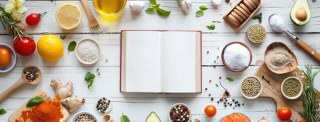 an open recipe book surrounded by an array of different ingredients on a pristine white wooden table, leaving ample space for text