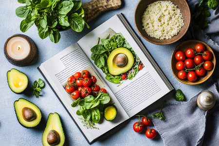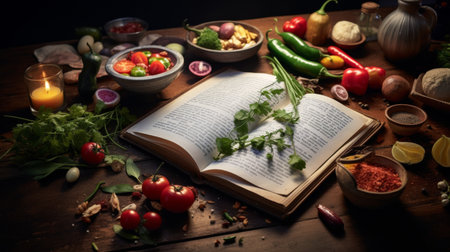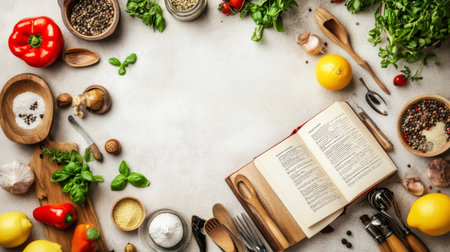 Open recipe book displays instructions while various fresh ingredients create a colorful and inviting atmosphere perfect for cooking inspiration