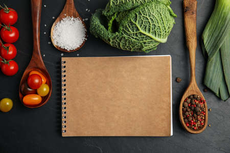 Recipe book and different ingredients on black table, flat lay with space for text. Cooking classes