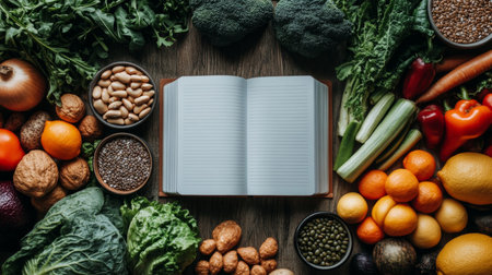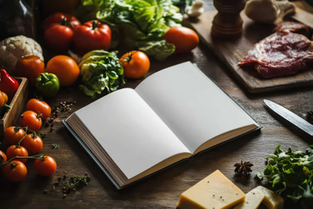 A blank recipe book lies open on a wooden kitchen surface, surrounded by vibrant vegetables, meat, and cooking essentials.