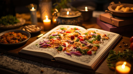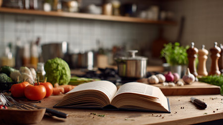 Generative AI : open cookbook on old wooden table in the kitchen