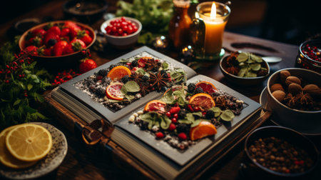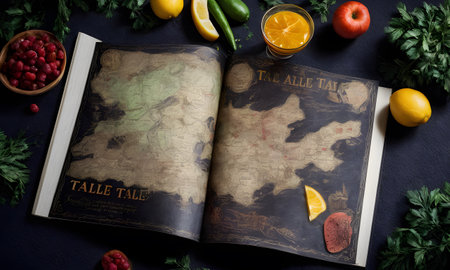 An open book displays an ancient map, surrounded by fresh fruits and vibrant greens, inviting readers on a journey through mythical lands. The scene is a feast for both the mind and the senses. AI Generative