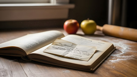 An open book, possibly a recipe book, lies on a wooden table. A handwritten note is placed on one of the pages. Two apples, one red and one green, and a wooden rolling pin are visible in the background, with a dusting of flour on the table.