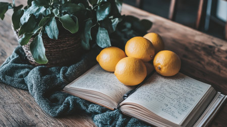 A charming scene featuring fresh lemons atop an open journal surrounded by lush greenery, perfect for evoking a cozy and inspiring home atmosphere.