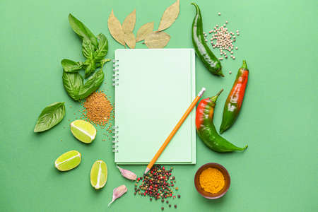 Empty notebook with different spices on color background