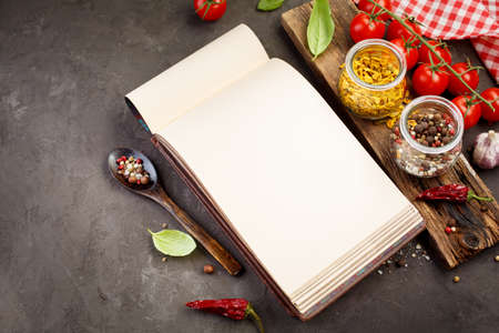 Spice for cooking and Blank recipe book. Food background with copy-space, top view