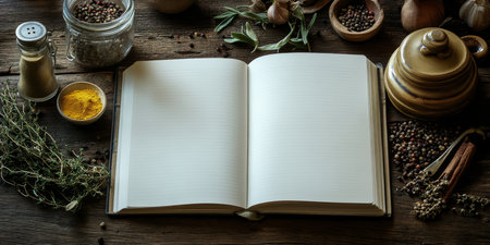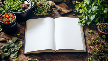 Open Blank Notebook Surrounded by Fresh Herbs, Perfect for Culinary Notes and Recipe Ideas