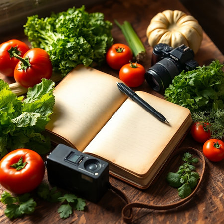 Notebook and camera on a wooden table with fresh vegetables and herbs