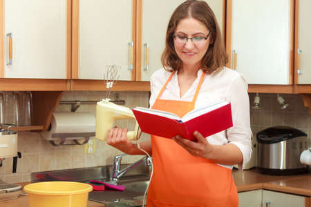 Housewife thinking and planning meal food. Mature woman chef cook with cookbook and mixer.