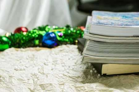 Stack of books on a table. Selective focus.