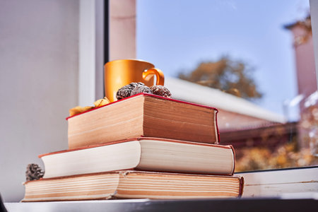 Bright autumn background with books and coffee mug. Reading a book in a sunny autumnal day on the windowsill. Spending cold weekends in cozy home