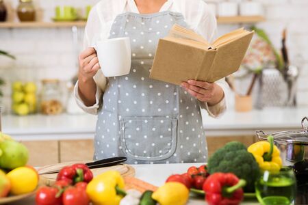 Woman reading cookbook and drinking coffee, looking for recipe. Girl standing near table with fruits and vegetables, crop