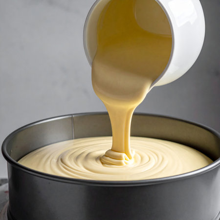 Smooth yellow batter flows from a white bowl into a dark grey springform baking pan.