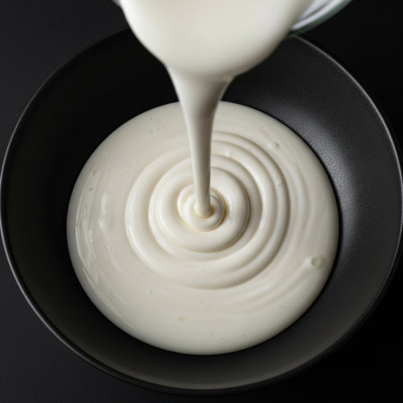 A pitcher pours a thick, creamy liquid into a metal bowl, creating a swirling pattern with a splash of droplets