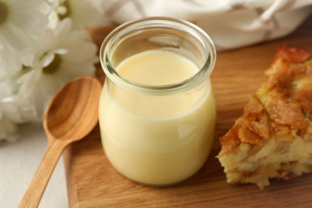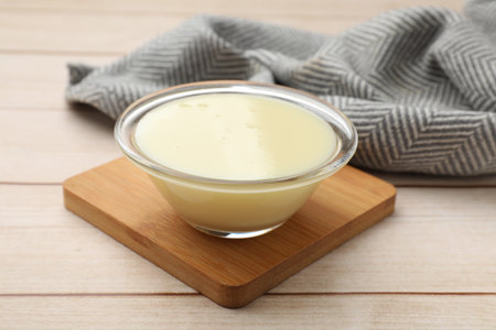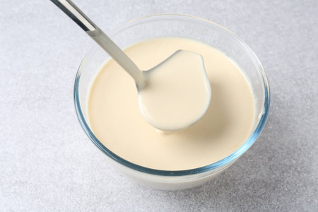 Spoon of pouring condensed milk over bowl on table. Dairy products