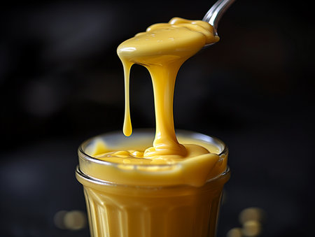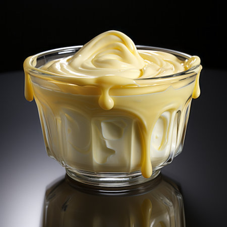 creamy orange liquid drips down the glass surface, resembling a cheese-like texture. captured with precision using the vray and tokina at-x 11-16mm f28 pro dx ii, the yellow and beige tones create a hyperrealistic rendering. this associated press photo showcases the intricate details and precisionist lines, making it a visually captivating image. ai generated