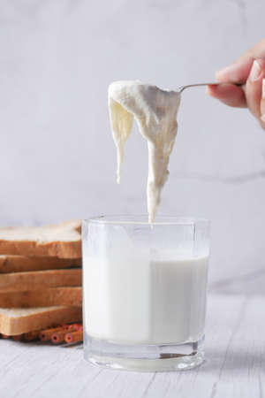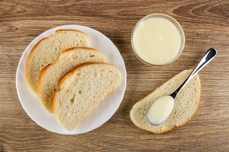 Slices of wheat bread in white plate, transparent glass bowl with condensed milk. teaspoon with milk on piece of bread on woodtn table. Top view