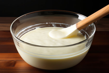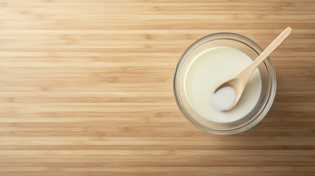 A clear bowl filled with creamy dairy substance sits on a bamboo surface, complemented by a wooden spoon, creating a simple yet inviting culinary scene perfect for food photography.