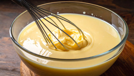 close up of a bowl of vanilla pudding with a whisk on wooden background