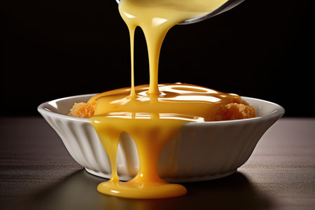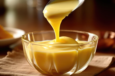 A close-up view of creamy vanilla sauce being poured into a white bowl, showcasing a smooth and glossy texture, perfect for desserts and culinary creations.