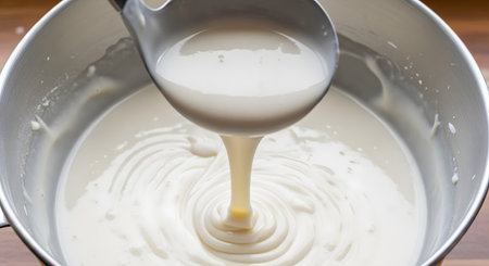 A close-up shot of a metal ladle scooping a thick, smooth, white cream or batter from a stainless steel mixing bowl. The liquid pours from the ladle back into the bowl, creating concentric ripples, illustrating cooking or baking preparation.
