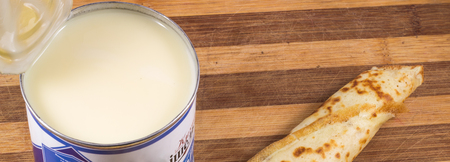 Condensed or evaporated milk in open tin on light concrete table. Top view.