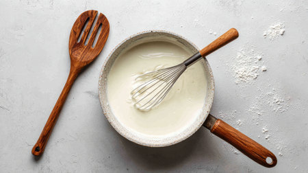 A creamy white mixture in a cooking pot, featuring a whisk and wooden spoon, placed on a textured gray surface, symbolizing homemade food preparation.