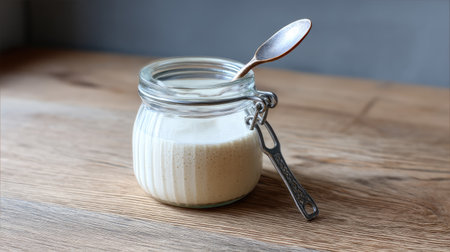 This image features a jar filled with a creamy white dairy product, complemented by a vintage spoon, all set on a rustic wooden table in soft natural light.