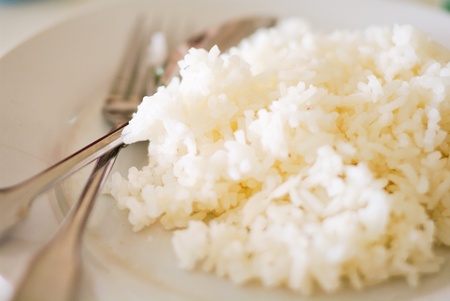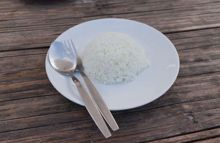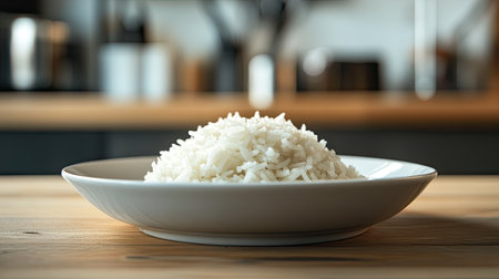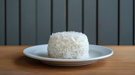 Side view of Jasmine rice on a white plate on a wooden table, focusing on texture and simplicity in food presentation.
