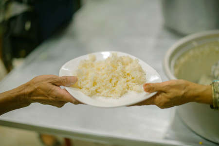 The hands of the beggars, who were helped by volunteers, offered delicious food: the concept of poverty.