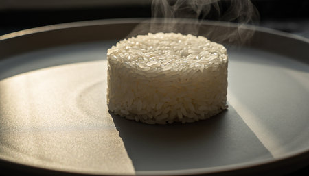 A steaming cylinder of white rice sits on a dark plate, catching the sunlight. Clear details and vibrant colo...
